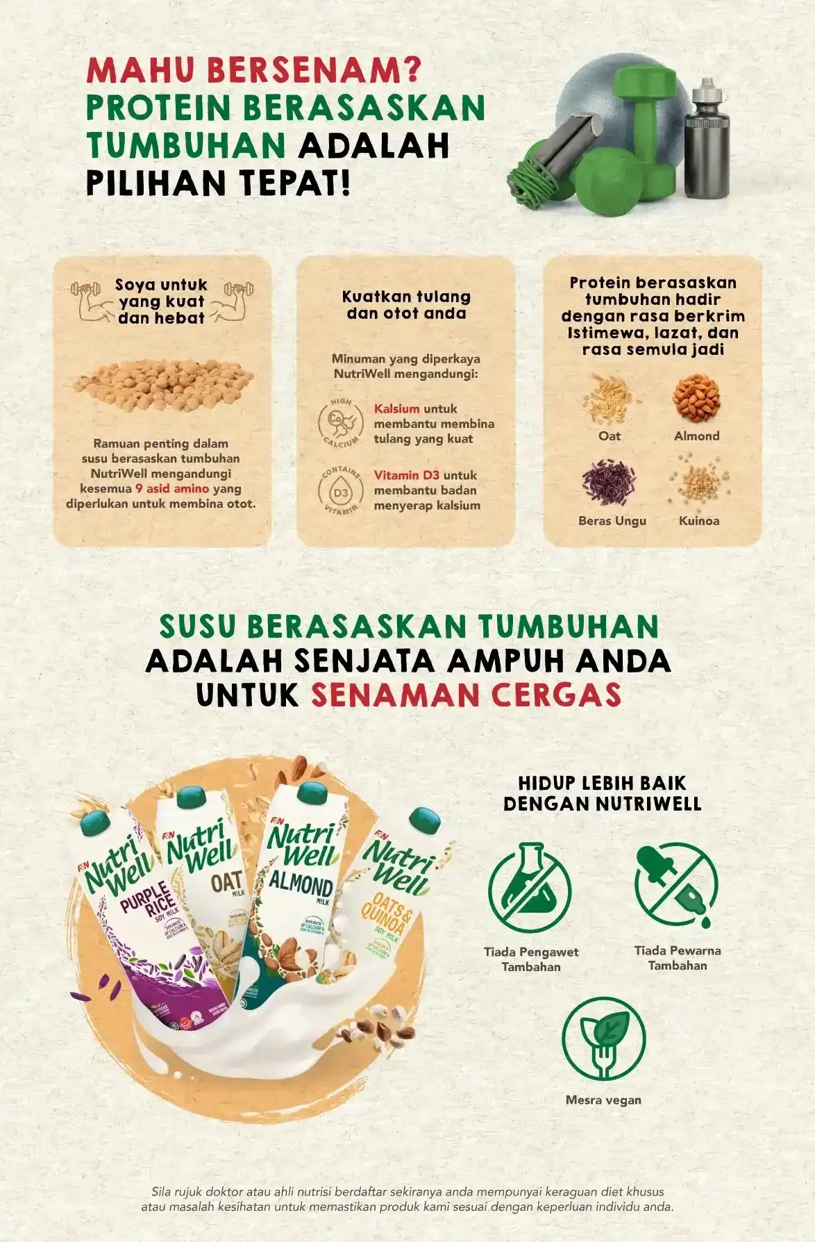 Diet dan senaman memainkan peranan penting dalam mencapai matlamat kesihatan anda – sama ada mengurangkan berat, membina otot, atau mengekalkan fizikal anda. Berikut adalah bagaimana protein berasaskan tumbuhan dalam NutriWell Susu Soya Beras Ungu dan NutriWell Oat & Quinoa memberikan anda tenaga semasa senaman.