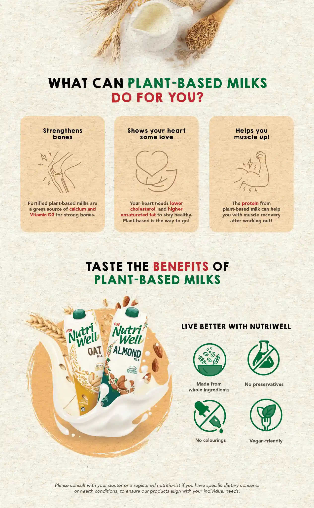 Whether you’re looking for a breakfast beverage or a quick tummy filler before lunch, NutriWell Oat M!lk and NutriWell Almond M!lk give you a quick boost with natural goodness.